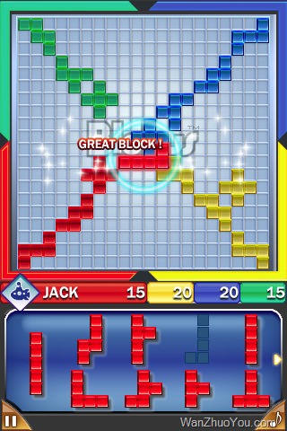 这是个字谜游戏,里面有个彩色砖堆从四排高中心柱翻落下来。中心柱两边都是三块砖的长度。砖有颜色并且组成1到3种符号。把砖块移到随便哪边,去组成成套的三种匹配颜色、图标数量或者图标的种类。在一套三块砖中多种的匹配能让你的分数翻倍。底上一排(在它上面的也都满了)在两边都满的时候会清掉。如果底上两边总是没有匹配,这个游戏就遭遇挑战并结束。 其他的模式有简单的时间限制。起初这个游戏看起来很容易很直接,但是随着更多的颜色和符号的出现,就越来越难找到匹配。 因为柱子有四层高,你可以把上边的砖块移到边上,但是轮到他们的时候才行。所以,底下的砖就只可以移到左边或右边的底下。 这个游戏就变成了一个非常需要长期策略的问题。我觉得这个游戏很有意思,并且当我体会到其中重叠的难度时,游戏变得更复杂。但是,只有当我觉得我征服了游戏之后,我才被强烈地吸引住继续玩。
